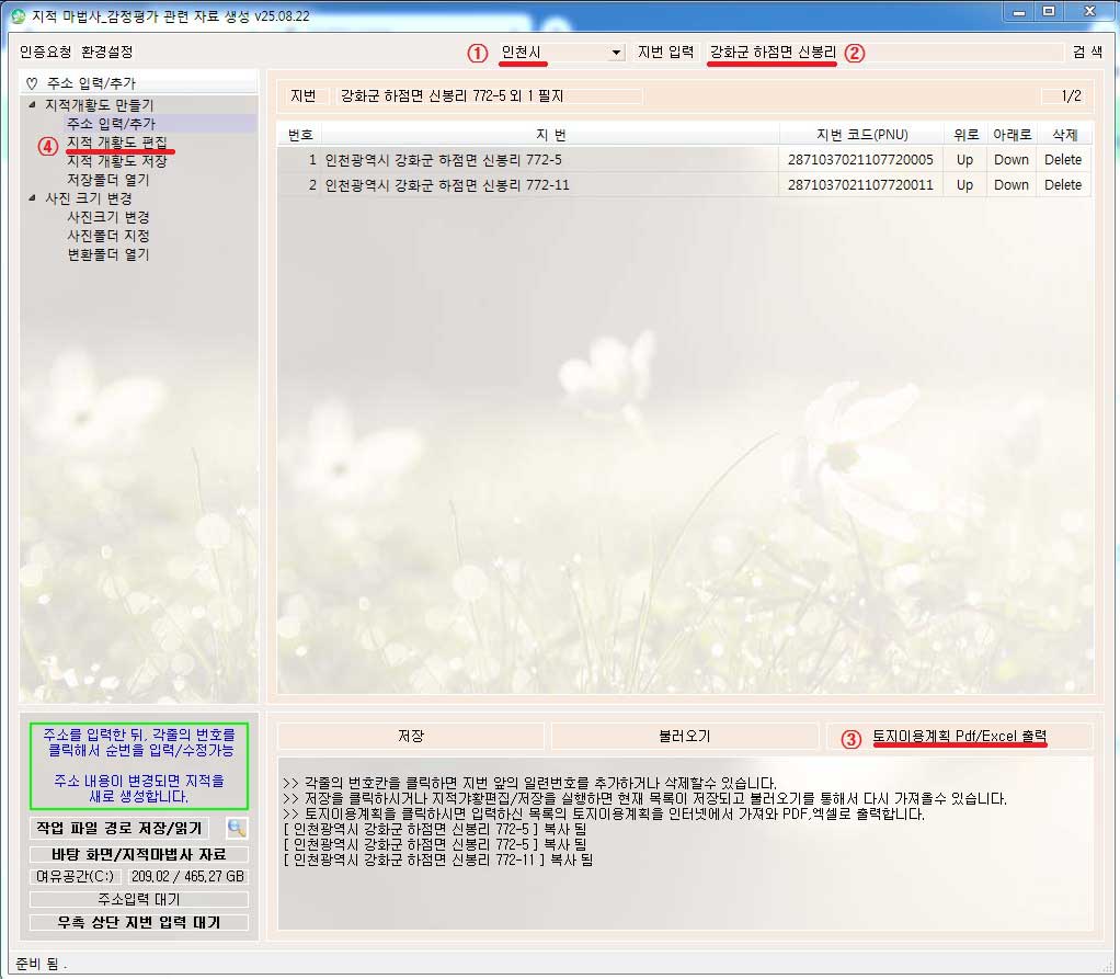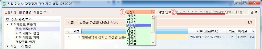 같은 읍면동리의 지번을 추가 할때는 지번 숫자만 입력합니다. ( 예 : 772-11 )
