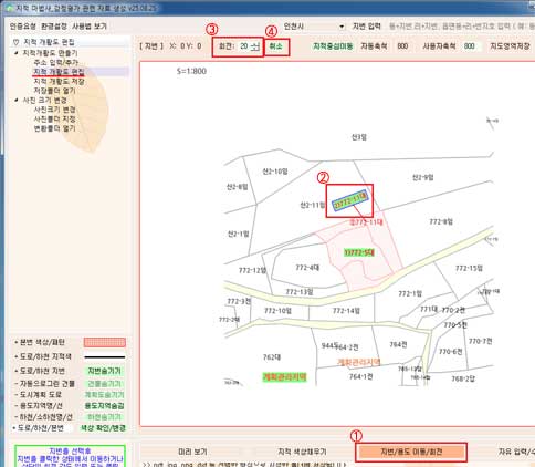 1. 화면 하단의 지번/용도 이동/회전 를 클릭