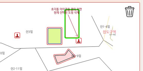 삭제 : 상단의 도형 이동 아이콘을 클릭 원하는 도형 선택후 우측 상단 휴지통 아이콘 클릭